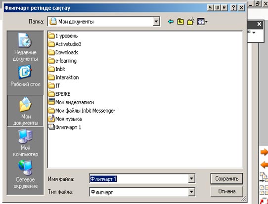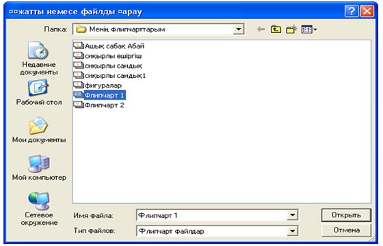 Құжатты немесе файлды қарау терезесі ашылады → Менің флипчарттарым (Сіздің флипчартыңыз басқа орында сақталған болуы да мүмкін, мысалы, Жұмыс үстелінде) → Қажет флипчартты шеріңіз → Открыть командасын басыңыз.