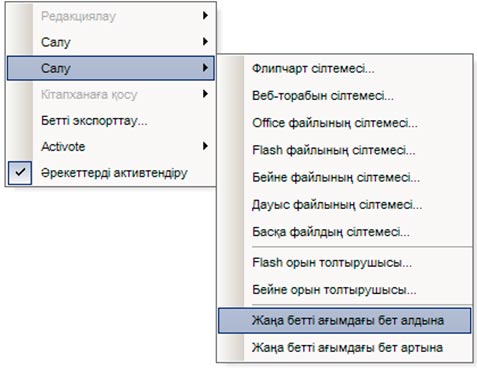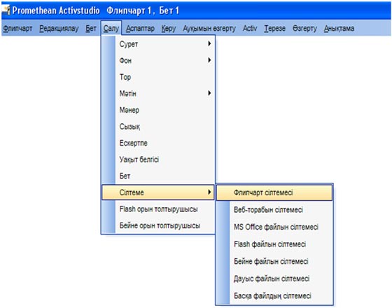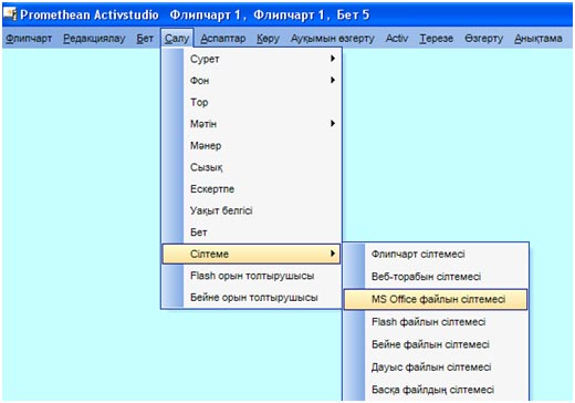 Енді флипчарт бетіне басқа флипчартқа сілтеме жасап көріңіз. Флипчарттың жоғары жағында орналасқан панельден Салу командасын таңдаңыз → Сілтеме → Сілтеме жасауға болатын файл типтерінің тізімі шығады → солардың арасынан өзіңіз сілтеме жасағыңыз келетін файл түрін таңдаңыз да шертіңіз: