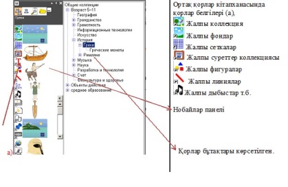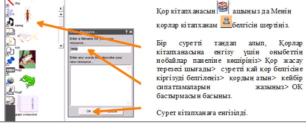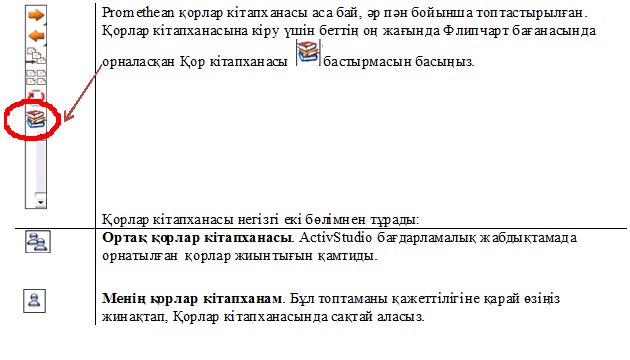 Қорлар кітапханасынан сурет алу үшін шертіңіз, қорлар белгісінен өзіңізге қажет топтаманы таңдаңыз. Мысалы: жалпы суреттерді, ашылған қорлар бұтақтарынан бір саланы таңдаңыз. Таңдаған суретіңізді тартып, флипчарт бетіне шығарыңыз. Бір фличарт бетіне бірнеше сурет орналастыруға болады.