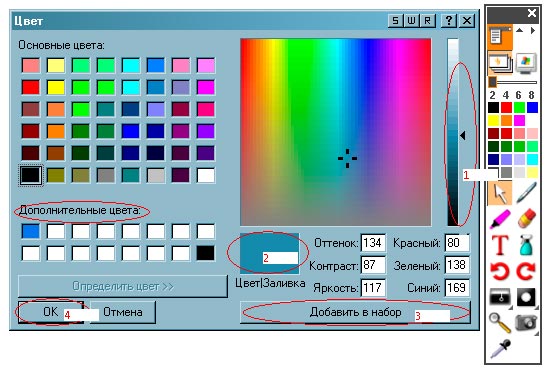 Алдымен қандай түс қосқыңыз келетінін 1) меңзердің көмегімен ашықтан қоюға дейін таңдаңыз, 2) түстің қандай екені терезеден көрініп тұрады, 3) таңдаған түсіңізді «Добавить в набор» пәрмені арқылы Қосымша түстер қатарына қосыңыз да, 4) ОК пәрменін таңдаңыз. Таңдалған түс аспаптар панеліндегі Түстер палитрасына қосылады.