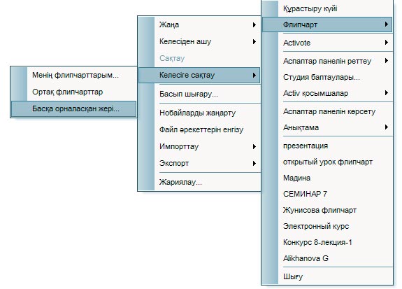 Жоғарғы менюден Флипчартты таңдаңыз → Флипчартты келесіге сақтау → Менің флипчарттарым немесе Басқа орналасқан жері → Жұмыс үстелі немесе Менің құжаттарым: