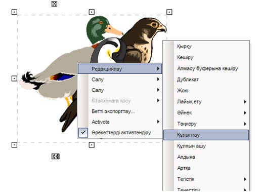Мына үш суретті біртұтас етіп топтастырайық: Нысандарды ерекшелеп алыңыз→Топтау пәрменін таңдаңыз. Немесе керісінше Топтастырылған нысанды топтан шығаруға да болады.