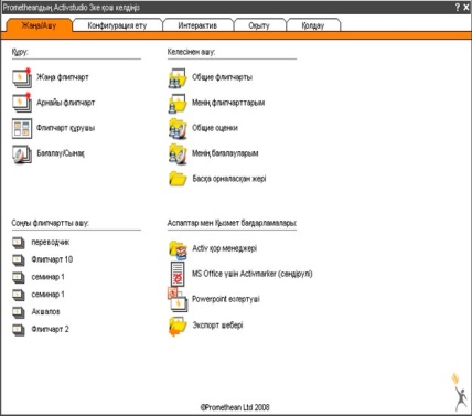 Басқару панелі Activstudio-ны іске қосқанда көрінеді. Онда Жаңа флипчарт ашудан бастап Activoteқондырғысын орнатуға дейін бірқатар әрекеттерді орындауға арналған сілтемелер бар.