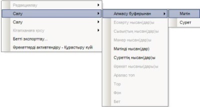 Ескерту: Егер Салу → Алмасу буферынан → Сурет командасын таңдасаңыз, мәтін сурет түрінде түседі де оны редакциялау мүмкін болмайды.