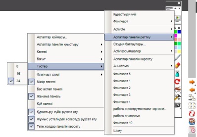 Түс палитрасында түстер санын көбейтудің тағы бір амалы: Бас меню бастырмасы→Аспаптар панелін реттеу→Түстер→24 командасын таңдаңыз.