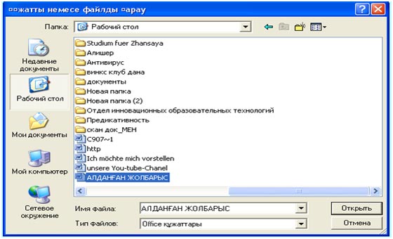 Жаңа Құжатты немесе файлды қарау терезесі ашылады. Қажет файлды табасыз. Мысалы, біз Мои документы папкасынан→Дыбыс файлын ерекшелейміз де→Открыть командасын басамыз.