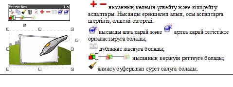Енді суретті жылжытып қалаған жерге орналастыруыңызға, өлшемін өзгертуге, қырқуға, көшіруге, дубликат жасауға, алдыңғы қабатқа шығаруға болады. Ол үшін суретті нысанның үстінен екі рет шертіңіз. Нысанды өңдеу панелі шығады. Панельде нысанмен жұмыс істеуге арналған әртүрлі аспаптар бар: