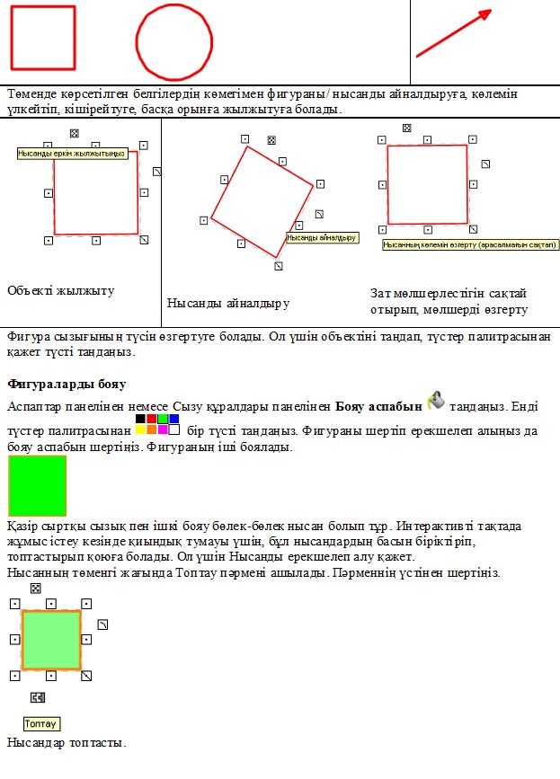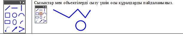 Сызу құралдарының бірін таңдап, кез-келген фигураны сызуға, түсін өзгертуге, айналдыруға, үлкейтіп-кішірейтуге болады.