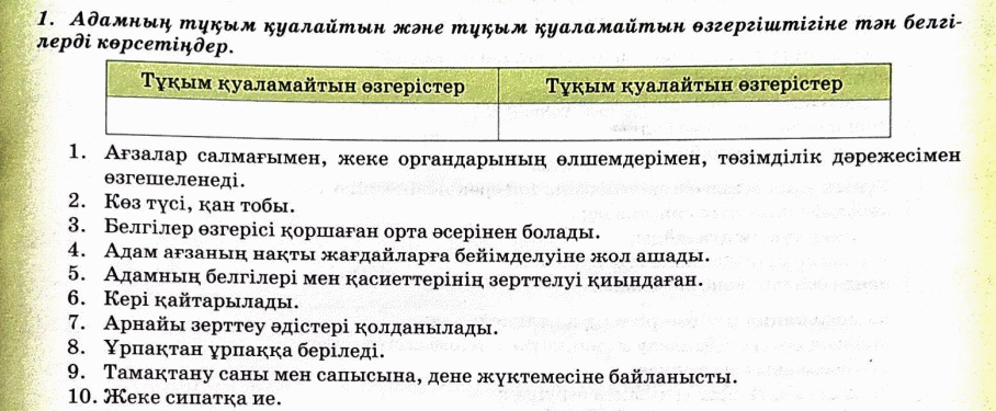 7.2.4.1 адам ағзасындағы тұқымқуалайтын және тұқым қуаламайтын белгілерді зерттеу; 7.2.4.2 үздік және үздіксіз өзгергіштікті атау |