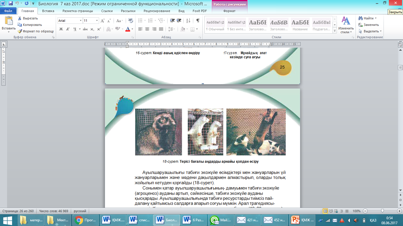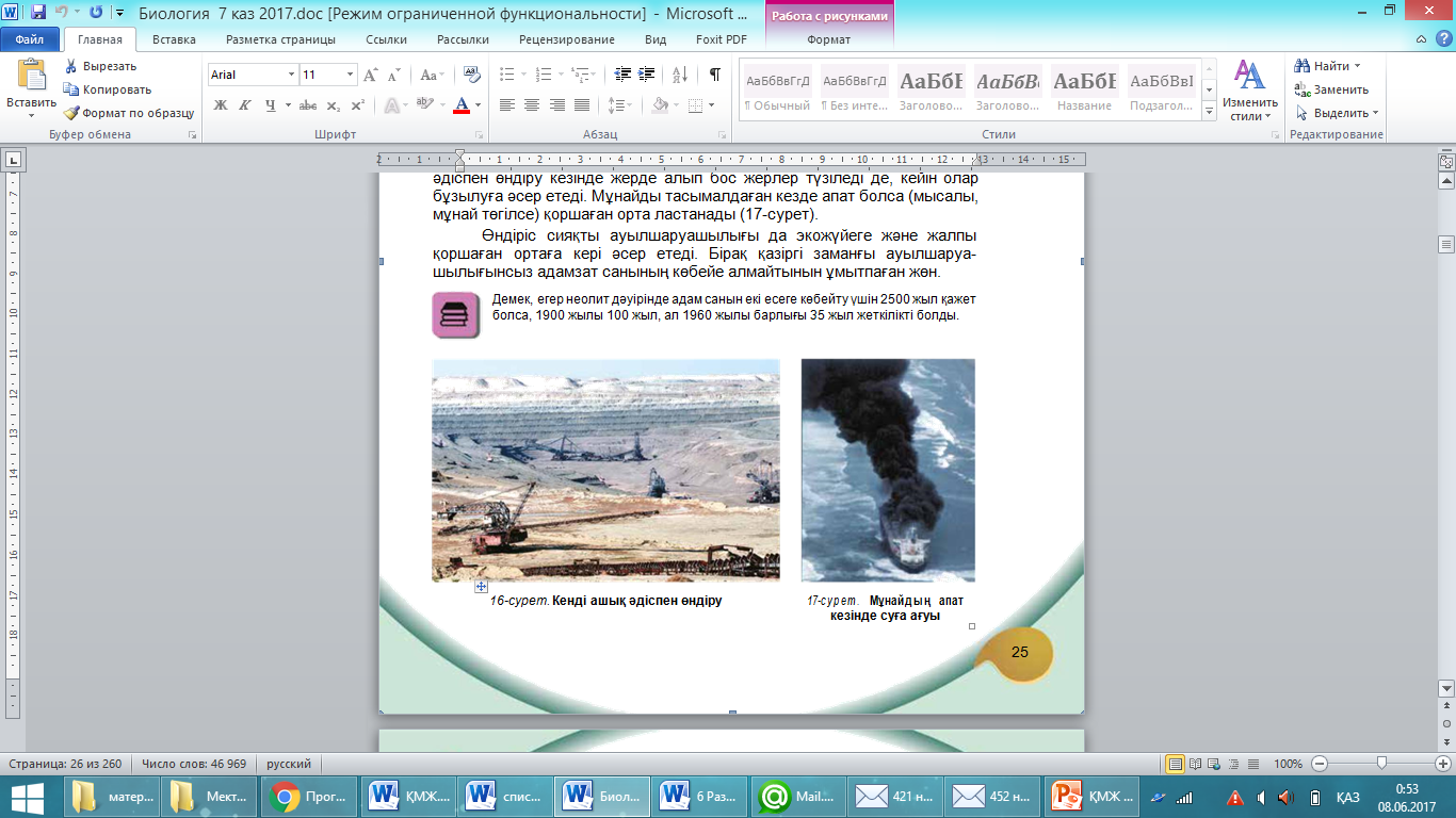 Білу және түсіну Берілген мәтіндерді балалар оқып алады. Адам іс-әрекетінің экожүйеге кері әсері. Адам іс-әрекетінің табиғиэкожүйеге кері әсері орасан зор.Ол үнемі арта түсуде. «Адамзат өзіс-әрекетінің салдарынан туындаған күрделі өзгерістерден жойылып кетпей ме?» деген сұрақ туады. Адамзат іс-әрекетінің экожүйеге едәуір күшті әсер ететін салаларын қарастырайық. Өнеркәсіптік өндіріс, бірінші кезекте, қоршаған ортаға көп мөлшерде түсетін зиянды шығарындыларымен байланысты. Қандай да бір өнеркәсіптік материалды алу үшін адам табиғаттан кен, мұнай, көмір сияқты басқа да заттарды алады. Ал пайдаланып болған соң олар химиялық өзгерген күйінде қалдықтар түрінде табиғатқа қайтарылады Өсімдіктер де, жануарлар да бұл қалдықтарды тірі ағзаларға зиянды емес заттарға айналдыра алмайды. Пайдалы қазбаларды қазып алу және тасымалдау қоршаған ортаға зиянды әсер етеді. Ашық әдіспен алу (өндіру) кезінде үлкен аумақта құнарлы топырақ қабаты толығымен жойылады . Шахталық әдіспен өндіру кезінде жерде алып бос жерлер түзіледі де, кейін олар бұзылуға әсер етеді. Мұнайды тасымалдаған кезде апат болса (мысалы, мұнай төгілсе) қоршаған орта ластанады.Ауылшаруашылығы табиғи экожүйе өсімдіктері мен жануарларын үй жануарларымен және мәдени дақылдармен алмастырып, оларды толық жойылып кетуден қорғайды.Сонымен қатар ауылшаруашылығының дамуымен табиғи экожүйе (агроценоз) ауданы артып, сәйкесінше, табиғи экожүйе ауданы қысқарады. Ауылшаруашылығында табиғи ресурстарды тиімсіз пай-далану қайтымсыз салдарға апарып соғуы мүмкін. Арал трагедиясы тәуелсіз Қазақстан үшін нағыз экологиялық апат болды Тура (тікелей) пайдалану – биологиялық ресурстарды жою өсімдіктер мен жануарлардың көптеген түрлерінің жойылуына себеп болды. Өндіріс сияқты ауылшаруашылығы да экожүйеге және жалпы қоршаған ортаға кері әсер етеді. Бірақ қазіргі заманғы ауылшаруа шылығынсыз адамзат санының көбейе алмайтынын ұмытпаған жөн. «Еркін микрафон» әдісі (Микрафонды бір-біріне беру арқылы әрқайсысы жауаптарын айтады.)
