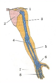 1-бұғана; 2-жауырын; 3-тоқпан жілік; 4-шығанақ сүйек; 5-кәрі жілік; 6-білезік сүйектері; 7-алақан сүйектері; 8-саусақ сүйектері.