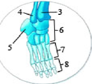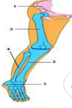 2- ортан жілік; 3- асықты жілік; 4- шыбық (садақ) сүйек; 5- өкше сүйек; 6- толарсақ сүйектері; 7- табан сүйектері;