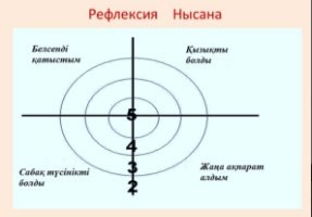 Бүгінгі сабақтағы өзінің әрекеті туралы, жаңа білімді меңгерудегі өзінің жетістіктері мен қиыншылығы туралы ой бөліседі. өзін бағалайды Тақтаға нысананың суреті ілінген, ол екі секторға бөлінеді. Сектордың әрқайсысына параметрлер-қалыптасқан әрекеттің рефлексиясы. Оқушыларға сабақ соңында бүгінгі сабаққа кері байланыс береді. Нысанаға жебені жабыстырады. Белсендіқатысты Қызықты болды Түсінікті болды Жаңаны білдім |