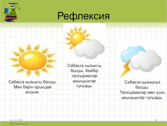 Бүгінгі сабақта оң әсер еткен жағдайларды, алған білімін сараптайды. Түсініксіз болған жайттарды мұғаліміне айтады.