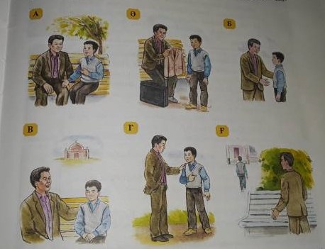 1.А.Манап бауырын іздеп 10жылдан соң тауып балалар үйіне келеді.Суретте Манап пен Қалидың кездесуі суреттелген. 2.Ә.Манап бауыры Қалиға жазда еңбек етіп,тапқан ақшасына сатып алған костюмін береді.Костюм Қалиға тар болып шығады.Қали оны досына бермекке Манаптан рұқсат сұрайды.Суретте Манаптың Қалиға костюмін бергені бейнеленген. 3.Б.Манап бауырының жатбауыр болып кеткенін көрседе,оған ауылы жайлы,көкесінің қайтыс болғаны жайлы айтып,әңгімеге тартты.Суретте Манап көкесінің зиратына тас белгі қойғанын,Қали түсінбеседе айтып жатқаны суреттелген. 4.Е.Қали Манапқа өз спорт жетістіктері туралы,өскенде ұшқыш болғысы келетінін айтып мақтанды.Суретте Қали Манапқа боксқа қатысып жүргенін айтып жатқаны бейнеленген. 5.Г.Жатбауыр болып өскен Қали Манаптың қасынан тездетіп кетіп,бокске жаттыққысы келіп отырды.Суретте Қалидың Манаптан жаттығу үшін асығып,кетуге сұрануы бейнеленген. 6.F.Манап Қалиды ішінен жақсы көріп тұрды.Оның миығынан күлгендегі күлкісінің көкесінің күлкісінен аумайтындығы Манаптың жүрегін елжіретті.Суретте Қалидың кетіп,Манаптың соңынан қимай қарап тұрғаны бейнеленген.