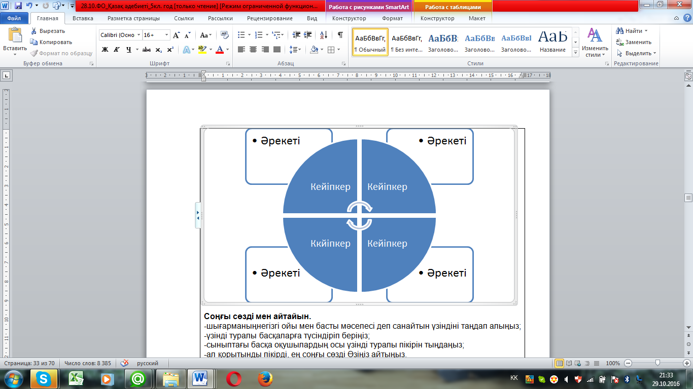 хат» Тақырыптық ақпарат Образ туралы түсінік Кейіпкер - персонаж көркем шығармада суреттелетін адам, әдеби образ. Әдебиетте адамның көркем образын жасағанда, жазушы оның кескін-тұлғасын, іс әрекетін, мінезін, сол ортаның, дәуірдің өзгешеліктерін танытатын сипаттарымен қатар, өзіне ғана тән ерекшеліктерді де анық байқалатындай етіп суреттейді. Кейіпкер бейнесін суреттеу үшін қоғамдық өмірді жан жақты, терең зерттеп білу шарт. Әр кейіпкердің көркем бейнесі оның өз сөзі арқылы ашылады. Көркем шығармада жанжақты толық суреттелетін негізгі тұлға – басты кейіпкер. Көркем шығармада сөзбен сомдалған кез келген құбылысты (көбінесе әдеби қаһарман бейнесін) образ деп атайды. Образ тек шындықты бейнелеп қана қоймай, оны жинақтайды. Образ – сөзбен салынған сурет. Образ әдеби тек тұрғысынан үш түрге: эпикалық, лирикалық, драмалық болып бөлінсе, жасалу тәсіліне қарай юморлық, сатиралық, фантасти-калық, трагедиялық, батырлық, т.б. болып бөлінеді. 1-тапсырма Берілген сызба негізінде әңгімеден мысалдар жинақтай отырып, негізгі кейіпкерлердің образын сипаттаңдар.