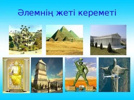 Өткенді пысықтау Үй тапсырмасы 6-тапсырма Өлеңдердің өзің қалаған біреуін жаттап ал Жаңа тақырып ФС тапсырмасы 1-тапсырма Құндылық мақсаты: Білімнің жаратылыстану және гуманитарлық салаларындағы тәжірибені бақылаудың, жүйелеудің және түсінудің қарапайым дағдыларының болуы Жұптық жұмыс “Ой қозғау” әдiсі Әлемнің жеті кереметі туралы естіп пе едің? Ой бөліс Әлемнің жеті кереметі туралы естіп, білгендерімен жұпта ой бөліс. Қосымша ақпарат:https://kk.wikipedia.org/wiki/Әлемнің_жеті_кереметі Әлемнің жеті кереметі: Хеопс пирамидасы, Вавилонның аспалы бақтары, Олимпиядағы Зевс мүсіні, Артемида храмы, Галикарнастағы мавзолей, Родос Колоссы, Александрия шамшырағы. 2-тапсырма «Сана аллеясы» стратегиясы Өз білімдерін YouTube желісінен «Әлемнің жеті кереметі» видеосымен танысу арқылы толықтыру. «Әлемнің 7 және 37 кереметі» атты кітаптан алынған «Вавилонның аспалы бағы» мәтінін оқы ЕҚБ және ЕБҚ «Суреттер сөйлейді» әдісі Қазақстанның керемет жерлерінің суреттерін топтастырыңдар.Олар туралы мәліметтер келтіріңдер 3-тапсырма «Суреттеуші» әдісі Мәтін мазмұны бойынша мұғалімнің көмегімен үзіндідегі аспалы бақты қазіргі аспалы бақтың суреттегі нұсқасымен салыстыр. Сергіту сәті