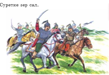 Бүгінгі өтілетін сабағымыздың тақырыбы не деп ойлайсыздар? Жарайсыңдар? Құндылық мақсаты: Өз елінің тарихы, мәдениеті туралы алғашқы түсінікті қалыптастыру Ұжымдық жұмыс: 1.Мына сурет бойынша не айтуға болады? 2. Суретте кімдер бейнеленген? 3.Олардың қазақ батырлары екенін неден аңғардың? 4. Суреттегі ақ боз атқа мінген батрды кім дер едің? 5.Қазақ батырлары неліктен атқа қонды деп ойлай- сың?