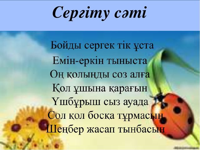 сәті Жеке жұмыс: 5 жолды өлең құрастырады: 1. 1 сөз – Тақырып (мысалы: "Мектеп") 2. 2 сөз – Тақырыпты сипаттайтын сын есімдер (мысалы: "Жаңа, жылы") 3. 3 сөз – Осы тақырыпқа қатысты етістіктер (мысалы: "Үйретеді, дамытады, өсіреді") 4. 4 сөзден тұратын сөйлем – Тақырыпқа байланысты ой (мысалы: "Мектеп – білімнің бастауы.") 5. 1 сөз – Қорытынды (мысалы: "Болашақ") Үй тапсырмасы Өлеңді Кері байланыс, «Алақан» әдісі: