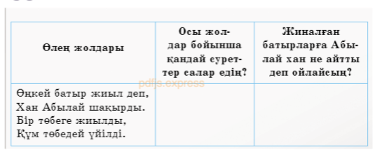 3.2.3.1 шығарманың тақырыбын анықтау және негізгі ойды білдіріп тұрған мәтін бөлігін, сөйлемді табу 3.2.6.1 кейіпкердің портртін сипаттау, оның іс-әрекеті, мінез-құлқының өзгеру себептерін мәтіннен дәлелдер келтіріп тауып бағалау |