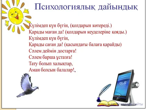 Сабақ тың басы 5 минут Өткенді пысықтау 5 мину Сабақ тың ортасы 20 минут Сергіту сәті 2 минут Сабақты қорыту 8 минут Кері байланыс 5 минут |