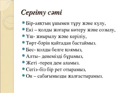 Балалардың барлығы орындарынан тұрып, қимыл-қозғалыс жаттығуын жасайды. Психологиялық ахуал қалыптастыру Үй тапсырмасын айтады Әңгімелейді Өлеңді оқиды Сергіту сәтін жасайды. Тапсырманы орындайды Кері байланыс |