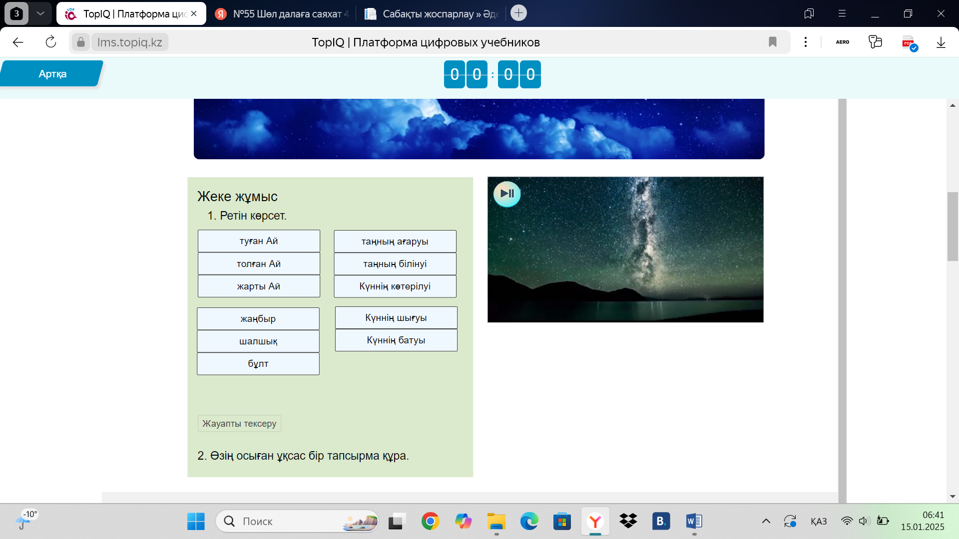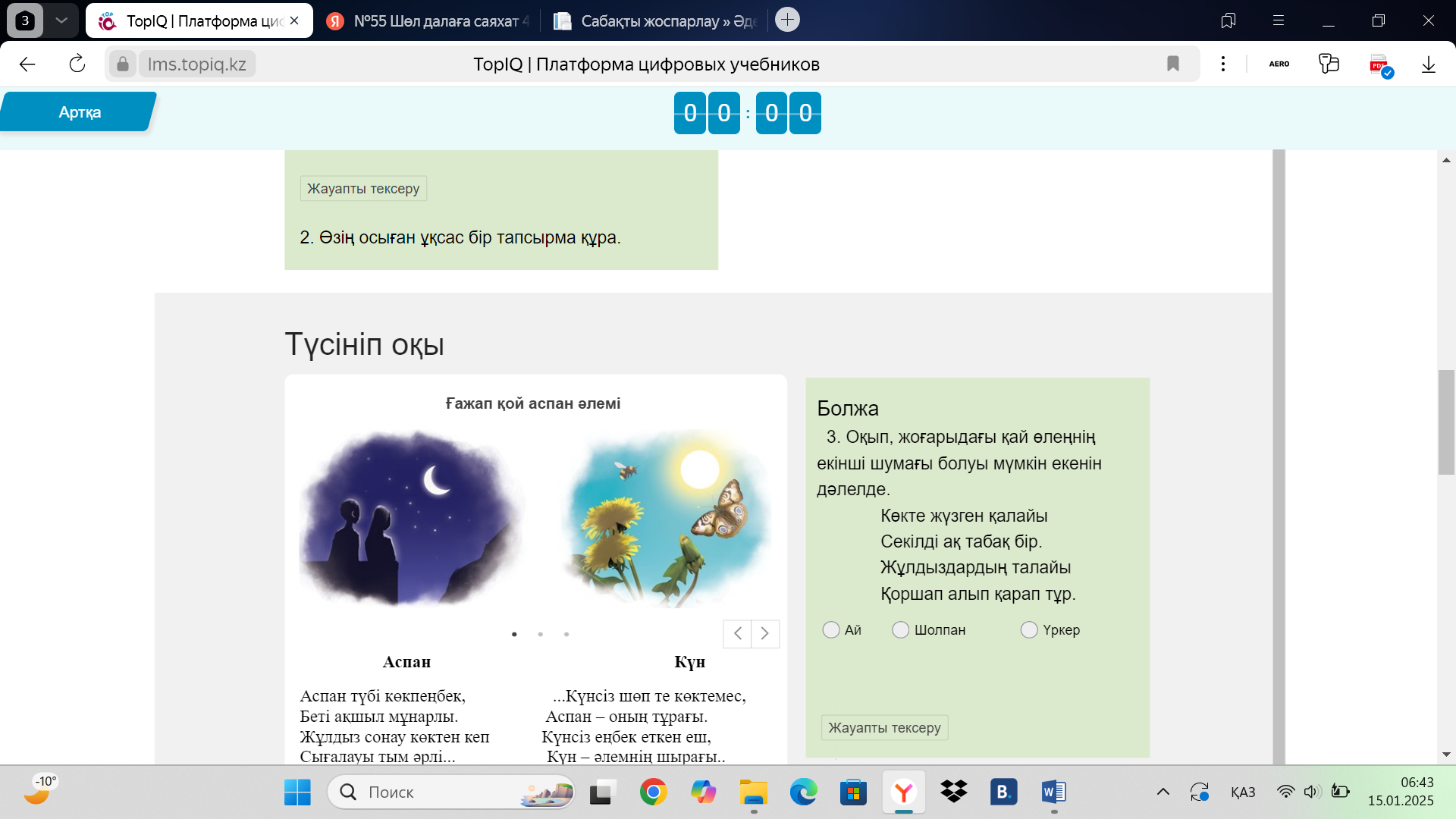 Тірек сөздердің ретін табады. Мәтінді түсініп оқиды. Сурет бойынша әңгімелейді. Оқып, жоғарыдағы қай өлеңнің екінші шумағы болуы мүмкін екенін дәлелдейді. Сұрақтарға жауапи береді. Тапсырмаларды орындайды. Жұмбақтарды шешеді. Топпен тапсырманы орындайды. Сұрақтарға жауап береді. Өздері білетін аспан денелерін атайды. |