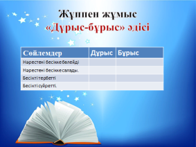 Өлеңді мәнерлеп оқып,түсініксіз сөздердің мағынасын ашады. Әр оқушы екі жолдан мәнерлеп оқиды Топпен жұмыс жасайды Топқа берілген тапсырманы орындайды. Жұппен жұмыс Барлық оқушы алдына берілген қағаздағы тапсырманың дұрыс, бұрыстығын орындайды, жұбын тексереді. Оқушылар өз ойларын айтады.