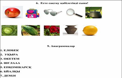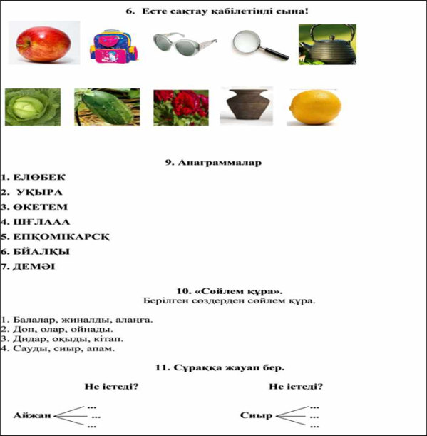 Дескриптор: Есте сақтау қабілетіңді сынап көреді-1б Анаграмманы шешеді-1б Өзінің сабаққа қай дәрежеде қатысқанын айтады . |