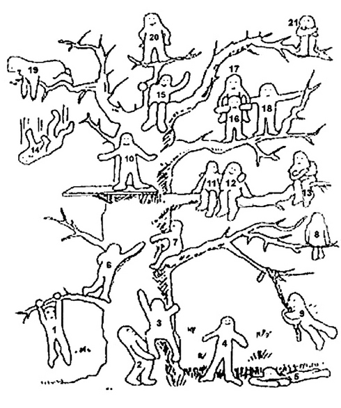 Ұсынылған сурет тақтаға ілінеді. Оқушыларға тапсырма: ағаштың қай жеріне өзіңді орналастырар едің? Өзіңді ағаштың қай жерінде сезінесің? Ағашта отырған әрбір адамның өзіне ғана тән көңіл-күйі мен ішкі жан дүниесі бар, оны бет әлпетінен ажыратуға болады. Қайсысы саған ұқсайды? Өзіңе ұқсаған адамды қарындашпен белгілеңдер.