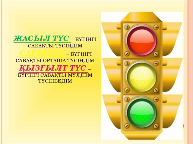 Жұмысты аяқтағаннан кейін оқушы дәптерге шаршының суретін салады. Егер жұмыс түсініксіз болса, шаршыны қызыл түске бояйды, егер аздап түсінікті болса - сарымен, тақырыпты жүз пайызға түсінгеніне сенімді болса, жасылмен бояйды.