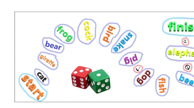 Мұғалім алдын-ала оқу бөлмесінің еденіне оқылған тақырып бойынша карточкалар қояды. Ойынға қатысушылар текшені кезекпен лақтырып, ойын алаңында жүреді. Әрбір қатысушының міндеті - түсірілген картадағы сөзді атау (1-сурет).