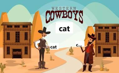 Оқушылар тобынан 2 қатысушы және 1 жүргізуші таңдалады. Қатысушылар ковбой кейпінде бір-бірінің арқасынан тұрып, бір қадам алға басып, көздерін жұмады. Бұл кезде жүргізуші белгілі бір сөзі бар карточканы көрсетеді