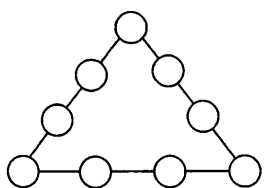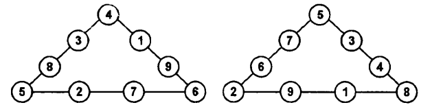 5-мысал. Есеп шарты: 1-ден 9-ға дейінгі цифрларды үшбұрыштың дөңгелектеріне оның әрбір қабырғасындағы цифрлардың қосындысы мен айырмаларының квадраттарының қосындысы бірдей болатындай етіп орналастырыңдар.