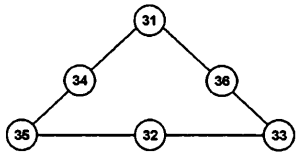 3-мысал. Есеп шарты: Тең қабырғалы үш бұрыш формада орналасқан мына алты дөңгелекке 31, 32, 33, 34, 35, 36 сандарын үшбұрыштың барлық үш қабырғаларында орналасқан сандардың қосындысы 100-ге тең болатындай етіп орналастырыңдар.