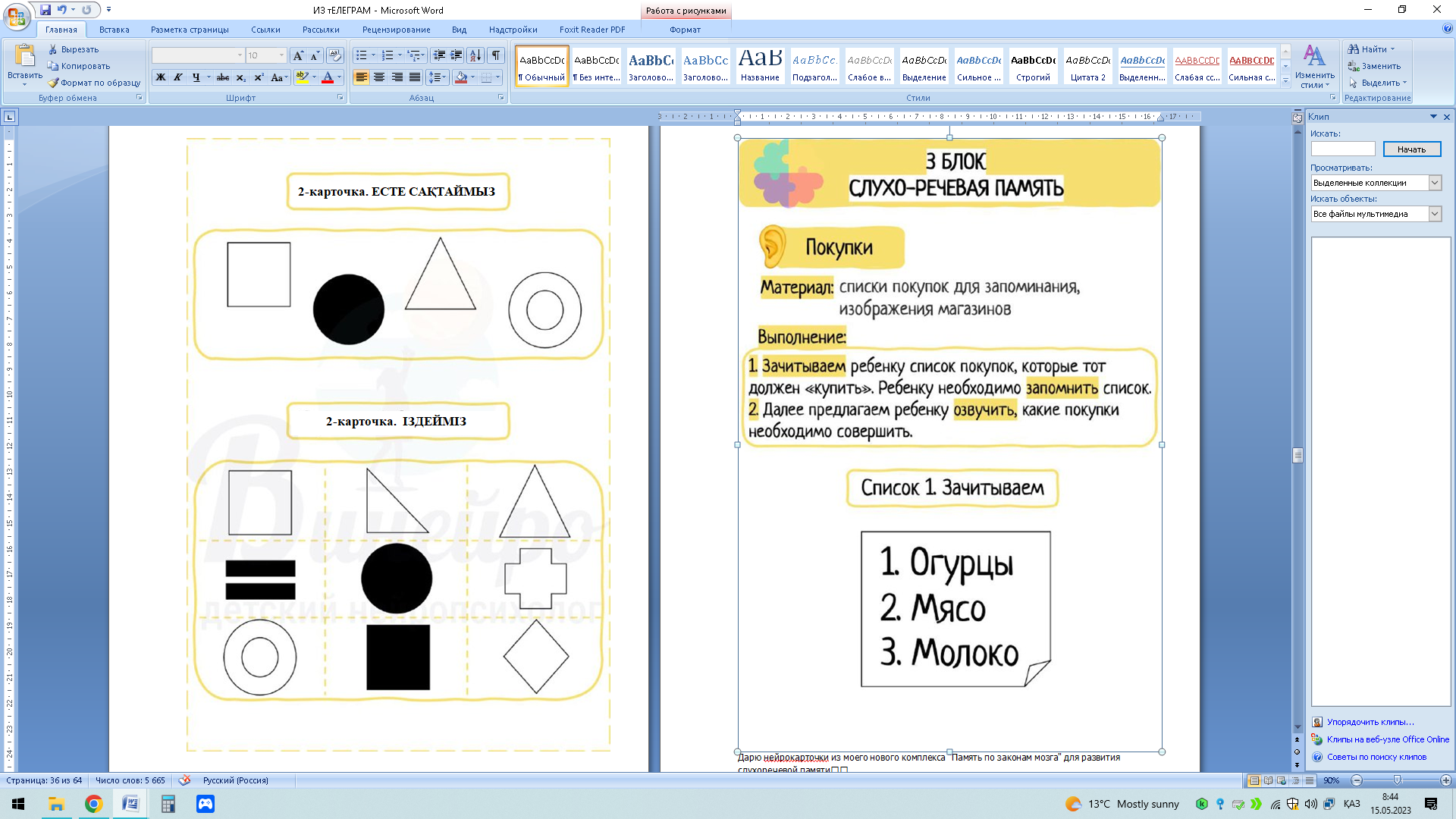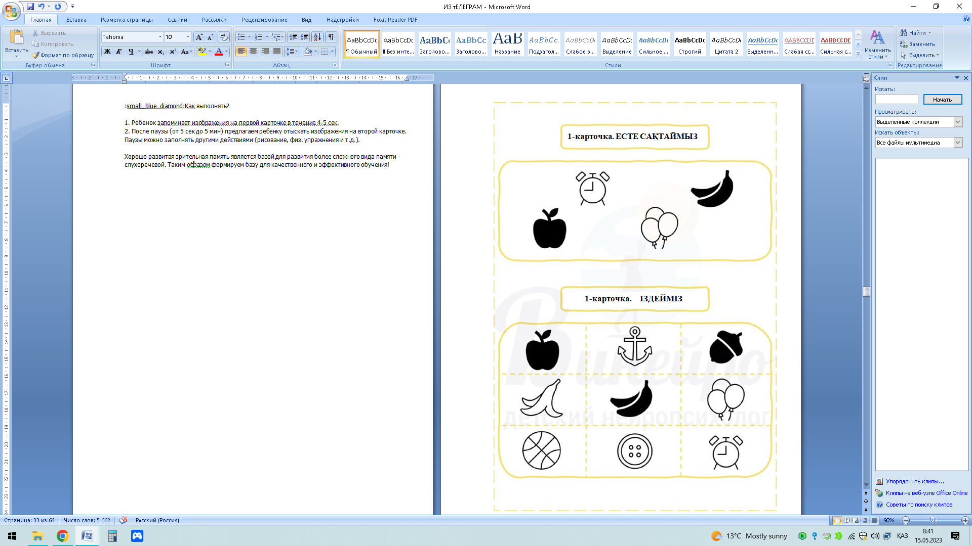 Үзіліс жасап, содан кейін (5секунд пен 5 минут арасы) екінші карточкадан бейнелерді іздеп табуын сұраймыз. Үзіліс уақытын басқа (сурет салу, дене жаттығулары және т.б.) әрекеттермен арнауға болады.