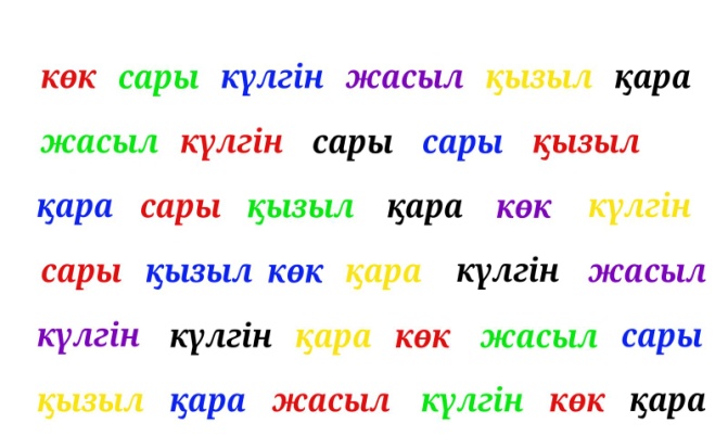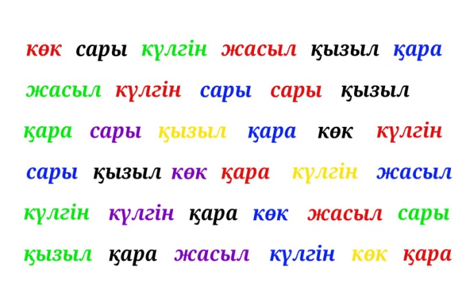 Балаға жұмысты түсіндіріп Струп тест карточкасын береді, бала оны орындап болғасын нәтижені бекіту мақсатында тағы бір карточка беріледі. Тапсырма тура және кері бағытта орындалады. Кері бағыт - ол карточканың оң жақ төменгі бұрышынан бастап оқуды білдіреді.