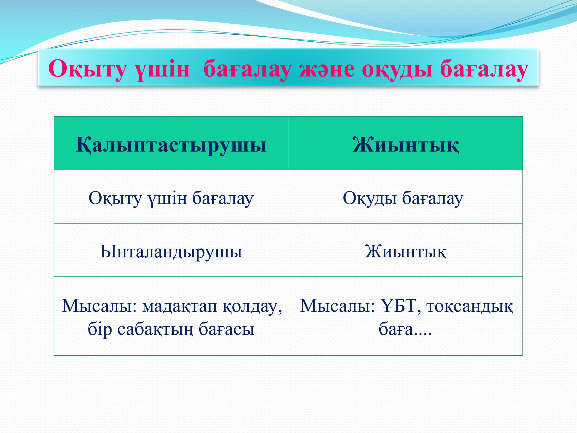 Баға, бағалау, оқуды бағалау, оқыту үшін бағалау, бағалау критерийі ұғымдары |