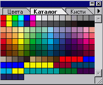 Каталог палитрасы Диалогты терезесін шақырып, құралдар палитрасынан сіз негізгі бояуды әрбір керек кезде пайдаланып отыратынсыз. Бірақ та егер сізге бірнеше бояуды араластыру керек болса, онда ондай жағдайда сізге арнайы түстер палитрасы көмектеседі. 1. Терезе менюін ашыңыз, Каталогты көрсету командасын таңдаңыз.Экран бетіне бағдарламасының қабылдауымен түскен түстер үлгілері бар палитра шығады. Түстер үлгілерінің үстінен курсормен басу арқылы ол пипетка формасына айналған да негізгі түс өзгереді, ал " Alt"пернесін басып тұрған жағдайда фондық түсті өзгертуге болады.