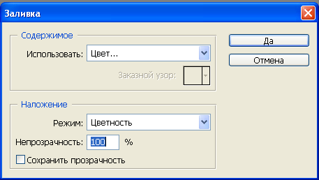 3. негізгі түс ретінде ашық жасыл түсті таңдаңыз. 4. Редактерлеу менюінен «заливканы орындау» бөлімін таңдаңыз. 5. Пайда болған диалогты терезеден сіз түстің параметрін алуыңыз керек. Тезенің жоғарғы бөлігінде «Содержимое» тізімінен «түс» пунктін таңдаңыз. (төм. сурет қараңыз.)
