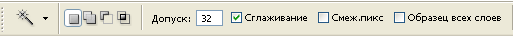 1. Ашық жасыл түсті таңдаңыз да үстінен басыңыз. Енді сол түс палитра құралдар тақтасында негізгі түс ретінде пайда болады. Кез кедген сурет салу құралы енді осы негізгі түспен салынады. Палитра құралының көмегімен және Сиқырлы таяқша құралының көмегімен бояу. 2. Соның көмегімен суреттің көйлегін таңдаңыз. Егер топтап алу қажет болса Shift перненің көмегін қолданыңыз Волшебной палка опциясындағы «тегістеу» бөлігіне жалауша қойылуы тиіс. ( төмендегі суретті қараңыз).