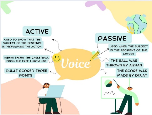 Define and differentiate active and passive voice. Determine the relevance of learning about active and passive voice. Compare active voice and passive voice in different tenses Ырықты етіс және ырықсыз етіс түрлерін анықтау және ажырату. Ырықты етіс және ырықсыз етіс түрлерін үйренудің өзектілігін анықтау. Әр түрлі шақтағы етіс түрлерін салыстыру |