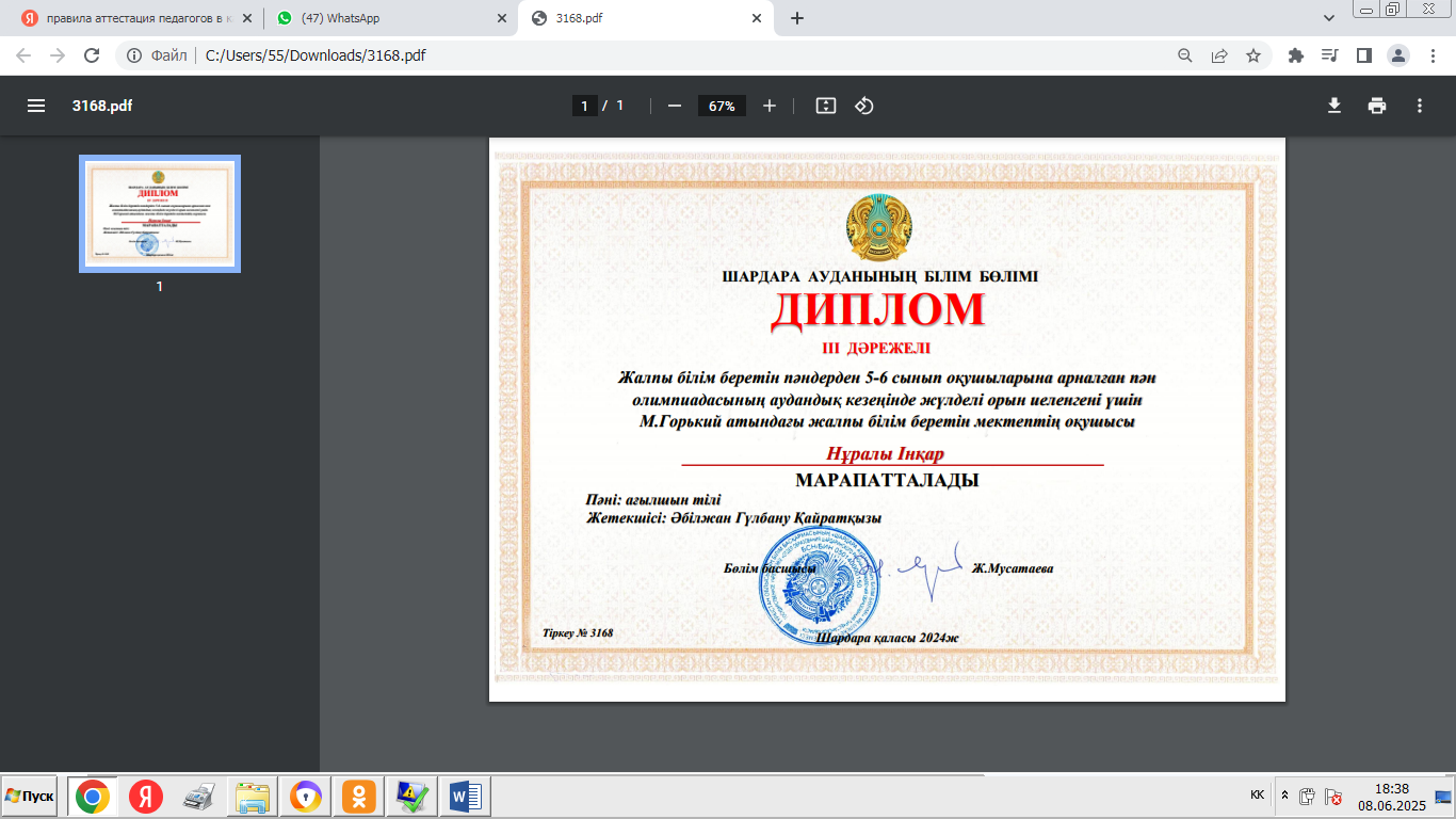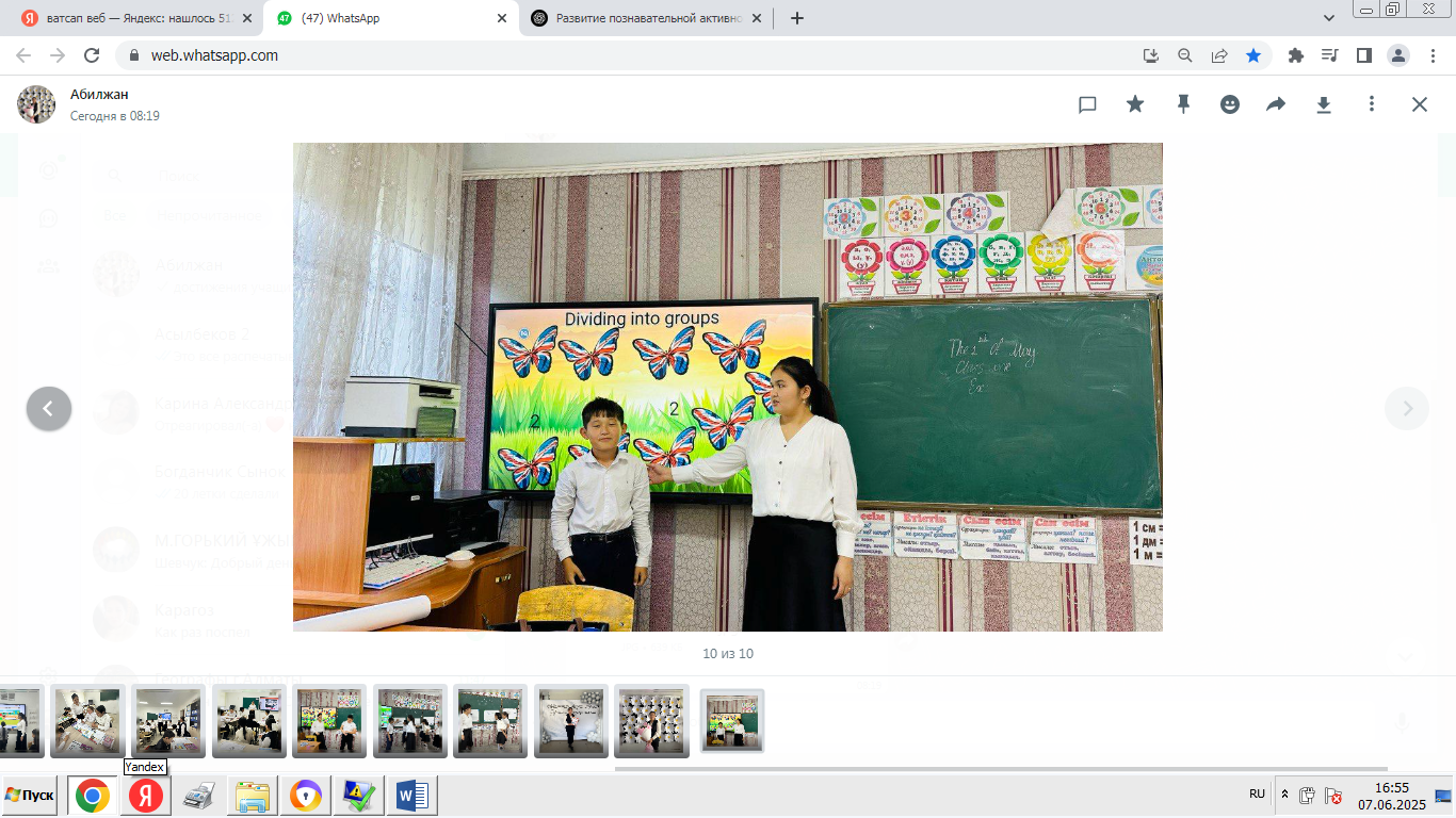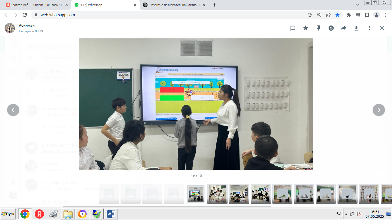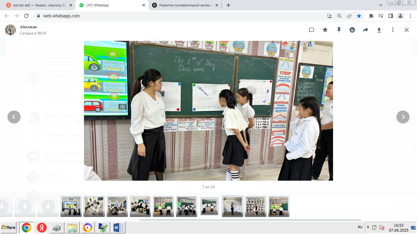 «Ағылшын тілі сабақтарында оқушылардың танымдық белсенділігін дамыту» тақырыбы бойынша педагогикалық тәжірибемді іске асыру барысында мен білім алушылардың оқу және тұлғалық динамикасында оң нәтижелерге қол жеткіздім.