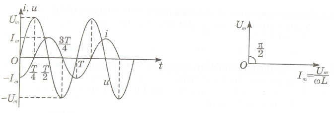 Индуктивтік кедергідегі ток пен кернеудің уақытқа тәуелділік графиктері мен осыған сәйкес векторлық диаграммасы.