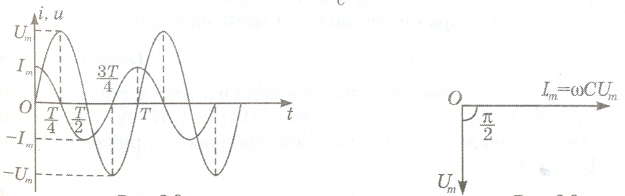 Тек қана сыйымдылық кедергісі бар тізбектегі айнымалы ток күші мен кернеудің уақытқа тәуелділік графиктері мен векторлық диаграммасы.