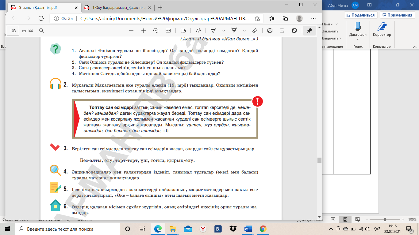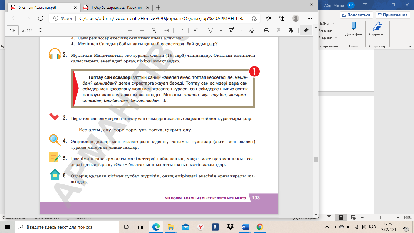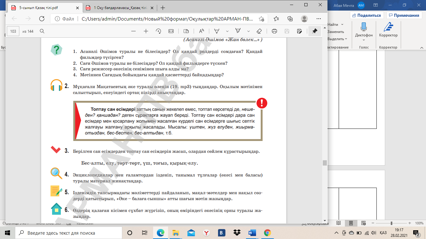 5.2.1.1 мәтіндегі негізгі және қосымша ақпаратты түсіну, анықтау; 5.3.5.1. Оқылым және тыңдалым материалдары бойынша негізгі ақпараттарды сақтай отырып, жинақы мәтін жазу. 5.4.4.4 сан есімнің мағыналық түрлерін ажырата білу, сан есімді зат есім орнына қолдана білу. |