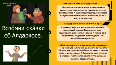 Основные термины и словосочетания: Алдаркосе,чудесная шуба, жадный бай, батыраки Используемый язык для диалога / письма на уроке: О чем идет речь... Допиши словосочетание… Допиши предложение…. Выпиши словосочетание… Соотнеси сказку с текстом... |