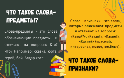 (Деятельность учащихся) Отвечают на вопросы. Дескриптор: 1. Что такое слова- предметы? 2. Что такое слова- признаки? 3. Приведите примеры Слова-предметы - это слова обозначающие предметы или явления природы, и отвечают на вопросы: Кто? Что? Например: большая машина. В этом словосочетании МАШИНА это слово – предмет, потому что обозначает предмет и отвечает на вопрос Что? -Отлично Слова – признаки – это слова, которые описывают предметы и отвечают на вопросы: «Какой?», «Какая?», «Какое?», «Какие?» (красный, интересная, новое, весёлые). Почему в словосочетаниях «жадный бай»,» чудесная шуба» у слова- признаков разные окончания?