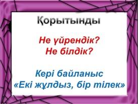 9.3.1.1мәтіндегі ақпараттың өзектілігін анықтау,қорытынды жасау; 9.5.1.3 ыңғайластық қатынасты білдіретін және қарсылықтық қатынасты білдіретін жалғаулықтардың қызметін білу, ауызша және жазба жұмыстарда орынды қолдану |