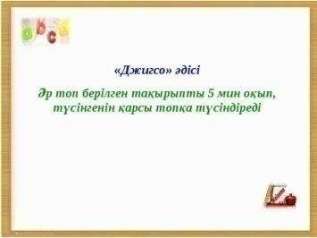 Оқушылар сұрақтарға жауап беріп, өзара ұжымдық талқылау жасайды. Осы тапсырманы орындау арқылы оқушылардың айтылым дағдысы қалыптасады «Ой шақыру» әдісін пайдаланып